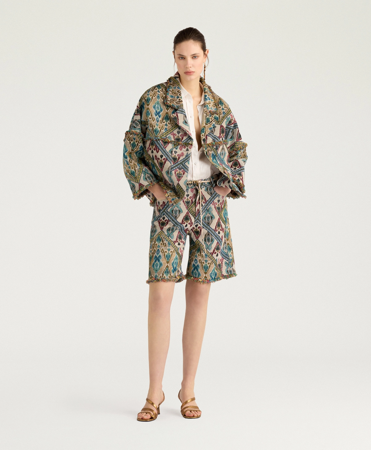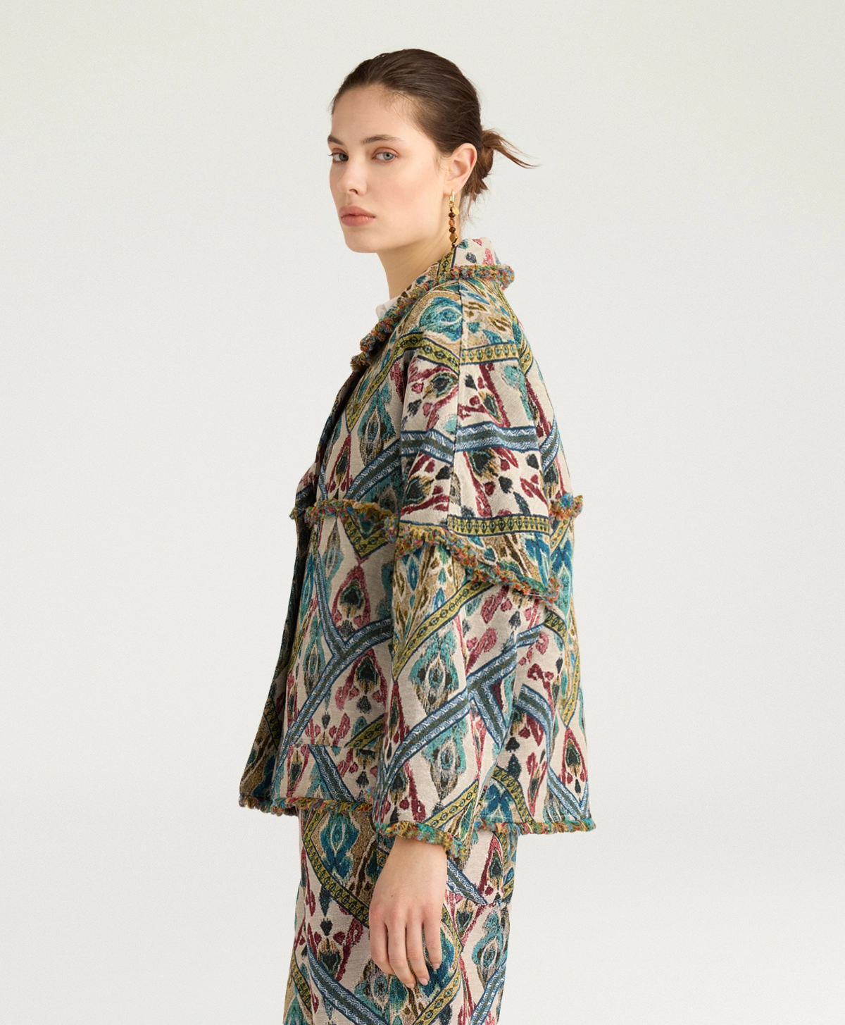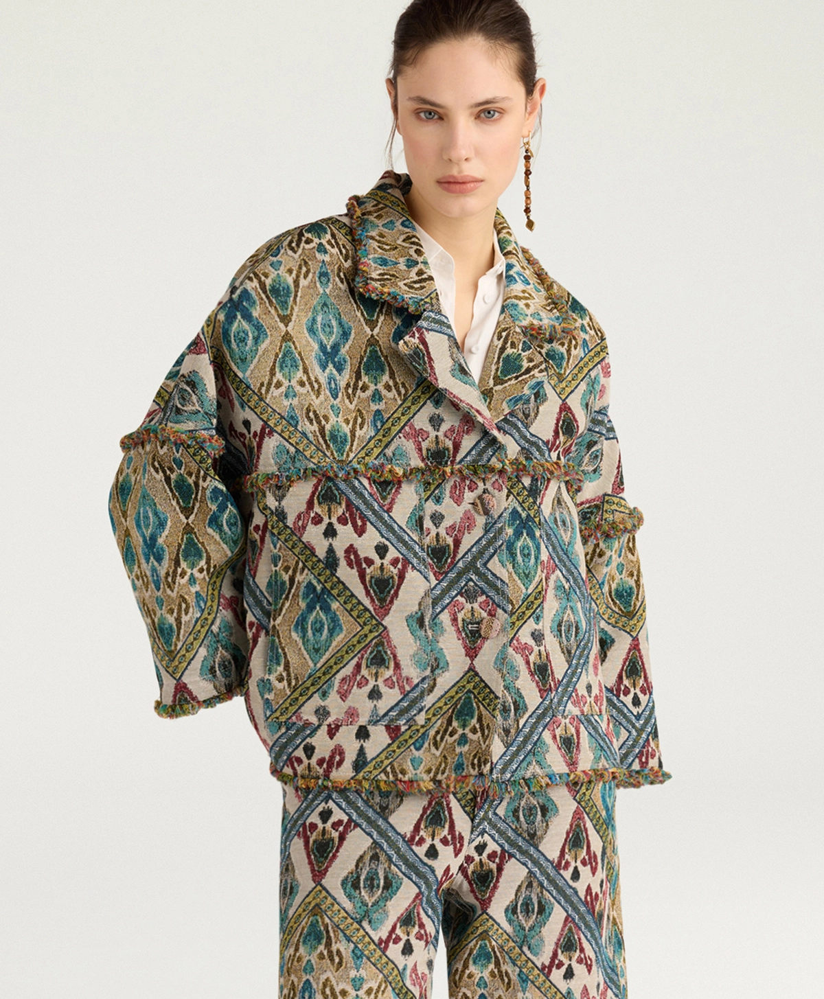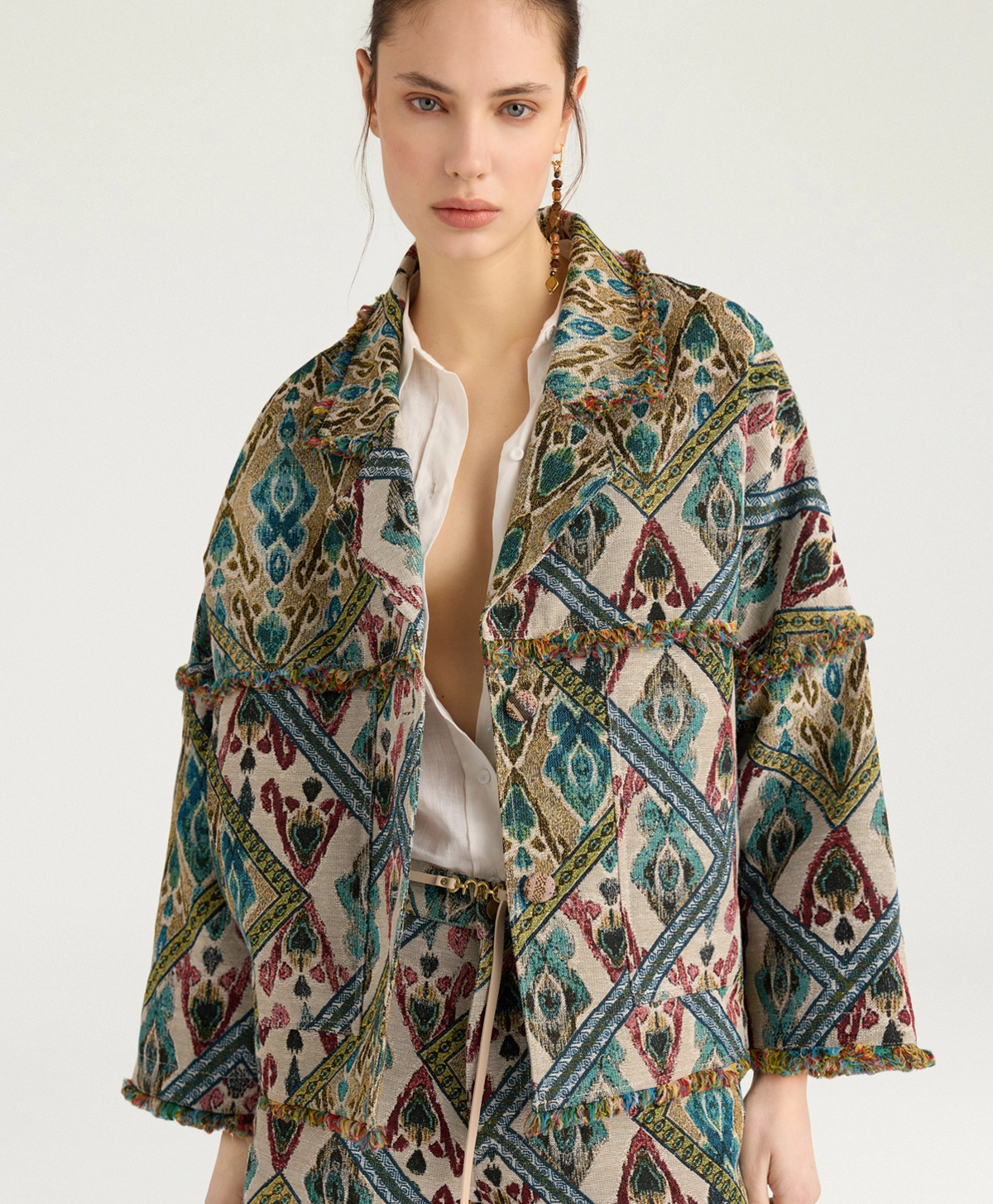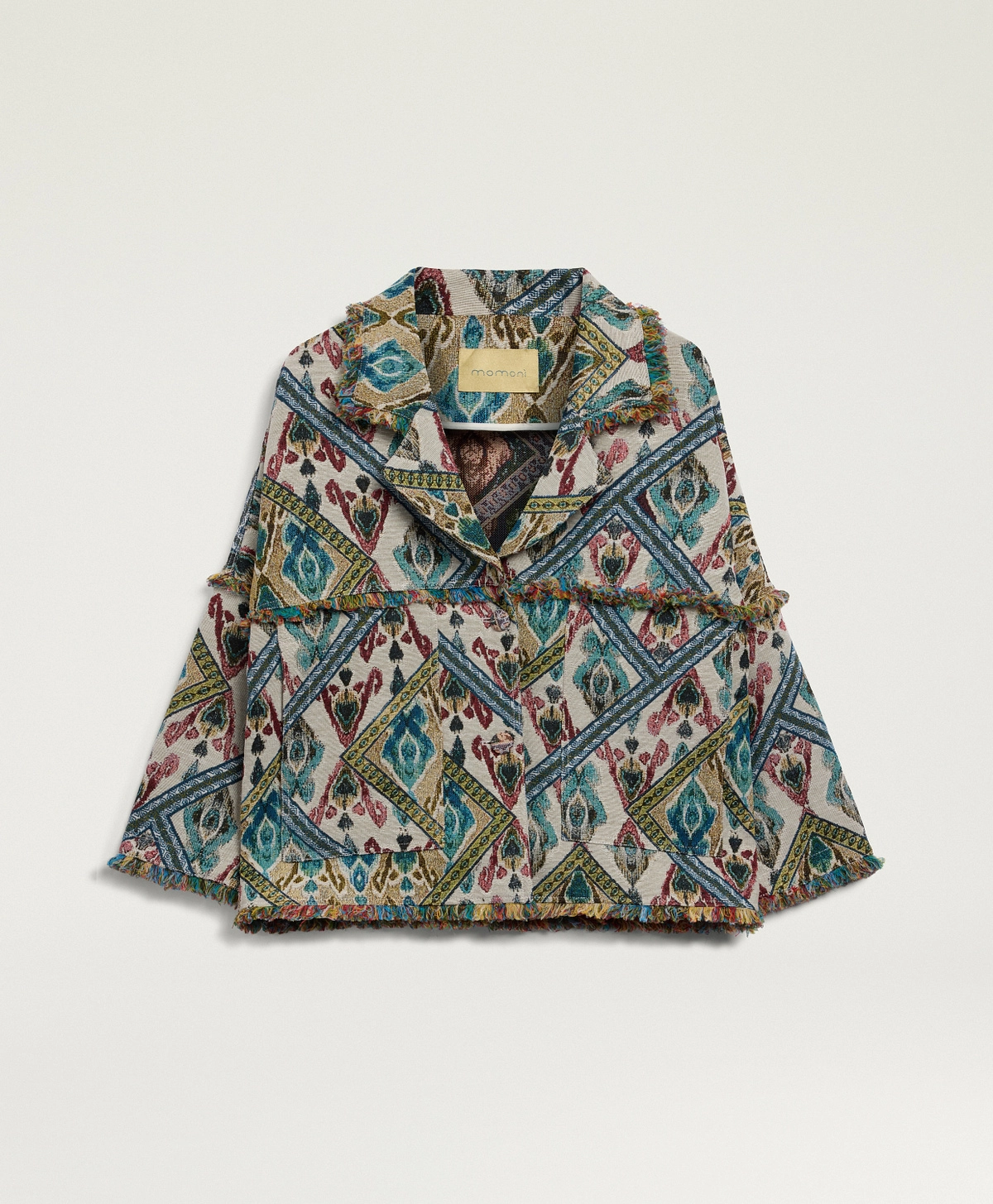 Cantadora jasje van Momoni in de kleur avio multicolor. Enkelvoudige reverskraag met lage knoopsluiting, gemaakt van jacquard geweven Gobelin-stof met exclusief Momonì-patroon. De omhullende maxi-vorm in combinatie met de franjes aan de randen maken de Cantadora tot een veelzijdige en elegante jas. Afgewerkt met dubbele stiksels. Combineer dit prachtige jasje b.v. op de Aspen pantalon en Cougr blouse van Momoni om de look compleet te maken. Deze en andere mooie items van Momoni vind je bij Louvigne op de webshop.