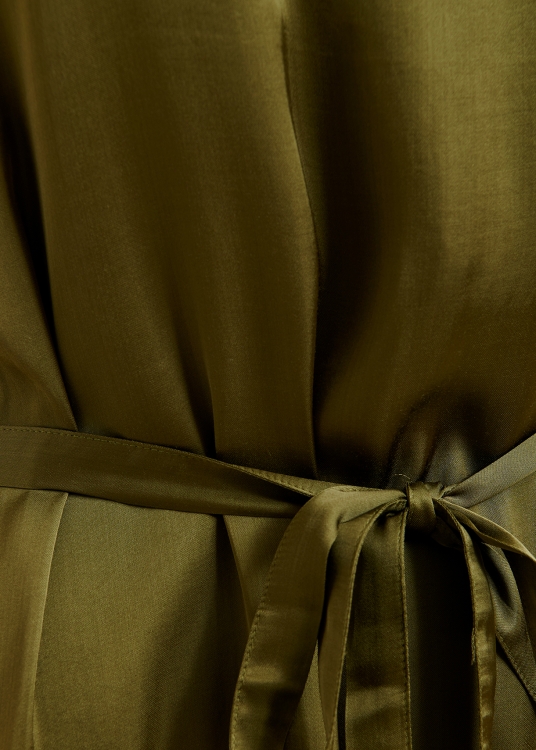 Productdetails: Lichte stof zonder stretch Ontworpen voor een relaxte pasvorm Asymmetrische pasvorm Volantdetails Lage mouwinzet Bijpassende riem Rechte snit Blinde ritssluiting Zijsplit olijfgroen