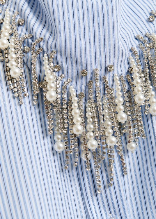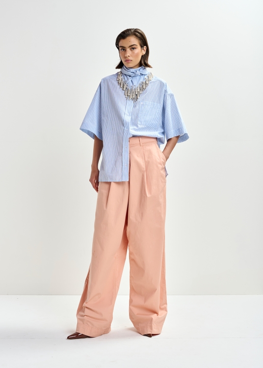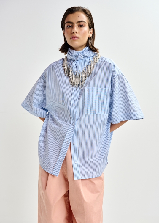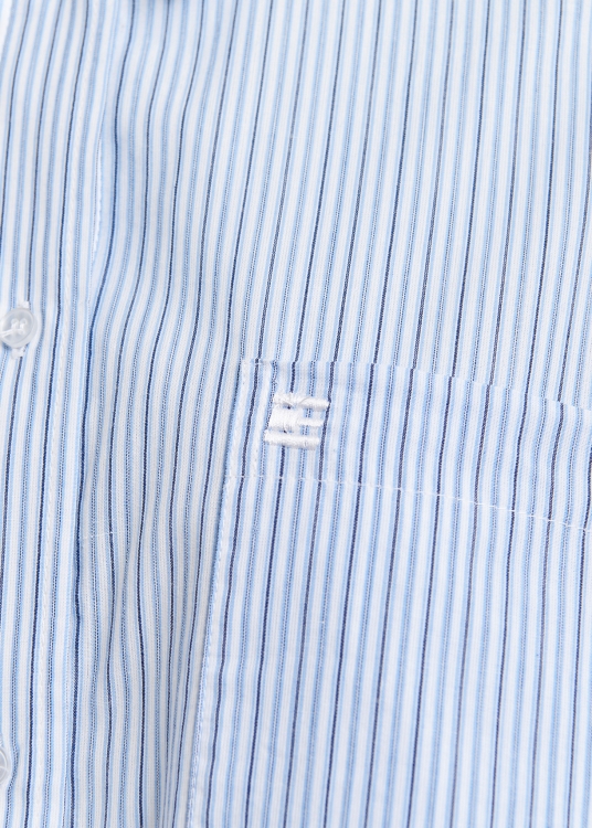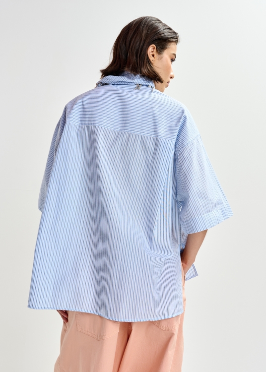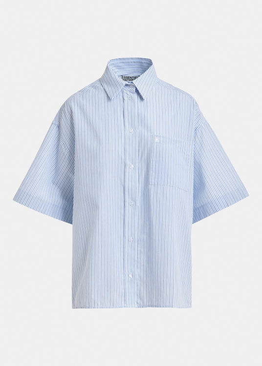 De Jasleen blouse van Essentiel Antwerp in de kleur blauw / wit gestreept. Oversized blouse van 100% katoen, ontworpen in een relaxte pasvorm. Het is voorzien van een klassieke kraag, een knoopsluiting en een lage mouwinzet. Het overhemd ontworpen met 3/4-mouwen, een borstzakje met geborduurde “E” en zijsplits voor extra bewegingsvrijheid. Een aparte driehoekige sjaal met versiering langs de onderrand zorgt voor een speels accent. Combineer deze bloese b.v. op de Joep jeans of Jo1 barrel jeans van Essentiel Antwerp om de look compleet te maken. Deze en andere mooie items van Essentiel Antwerp vind je bij Louvigne op de webshop.