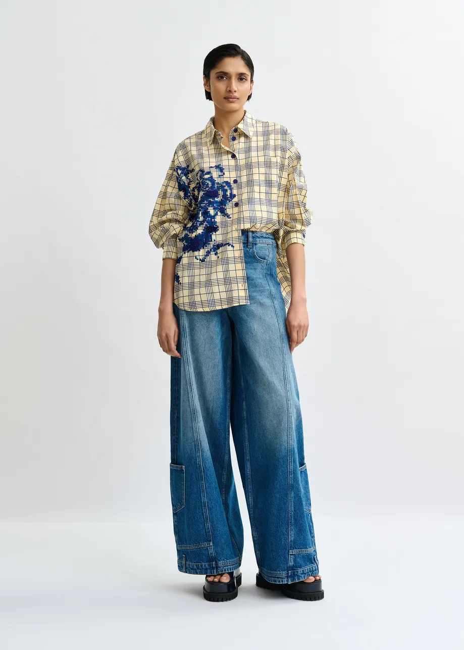 De Jubilee blouse van Essentiel Antwerp in de kleuren beige / donkerblauw.