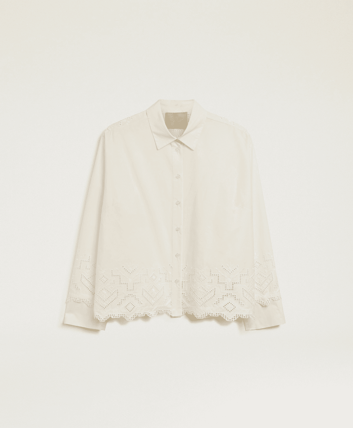 De Talavera blouse van Momoni in de kleur panna. Een blouse met een mannelijke pasvorm van katoenpoplin met exclusief Navajo-design in broderie anglaise. De Talavera, met zijn overhemdkraag, zichtbare knoopsluiting en maxi-manchetten, is een bijzonder, origineel kledingstuk, ideaal voor zowel een casual als een formele look. Manchetten, schouderstuk en zoom afgewerkt met geschulpte broderie anglaise. Combineer de Talavera blouse op de favorite jeans of pantalon om de look compleet te maken. Deze en andere mooie items van Momoni vind je bij Louvigne op de webshop.