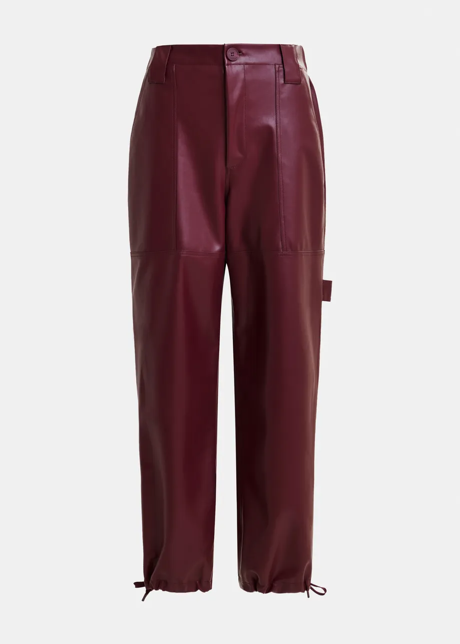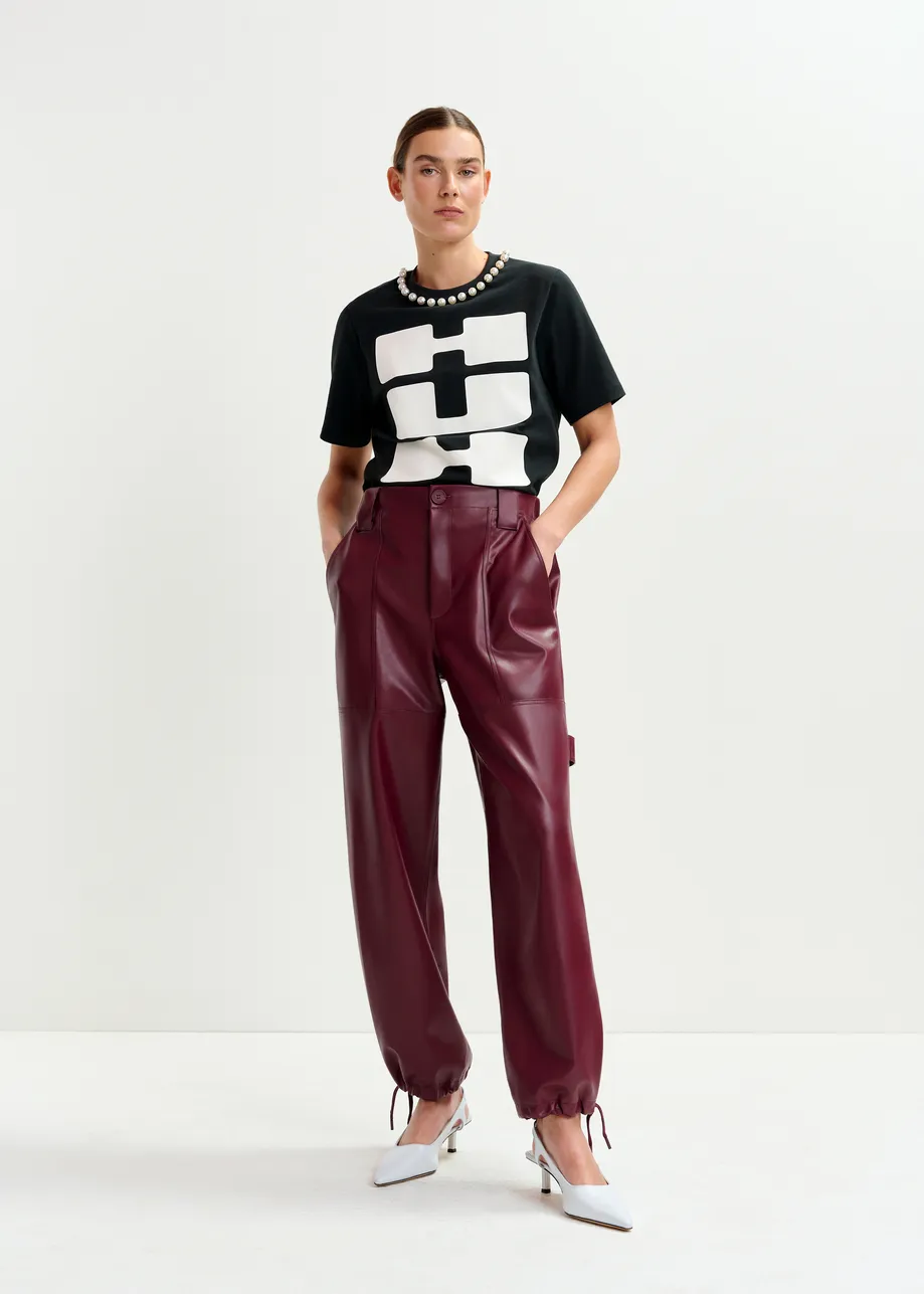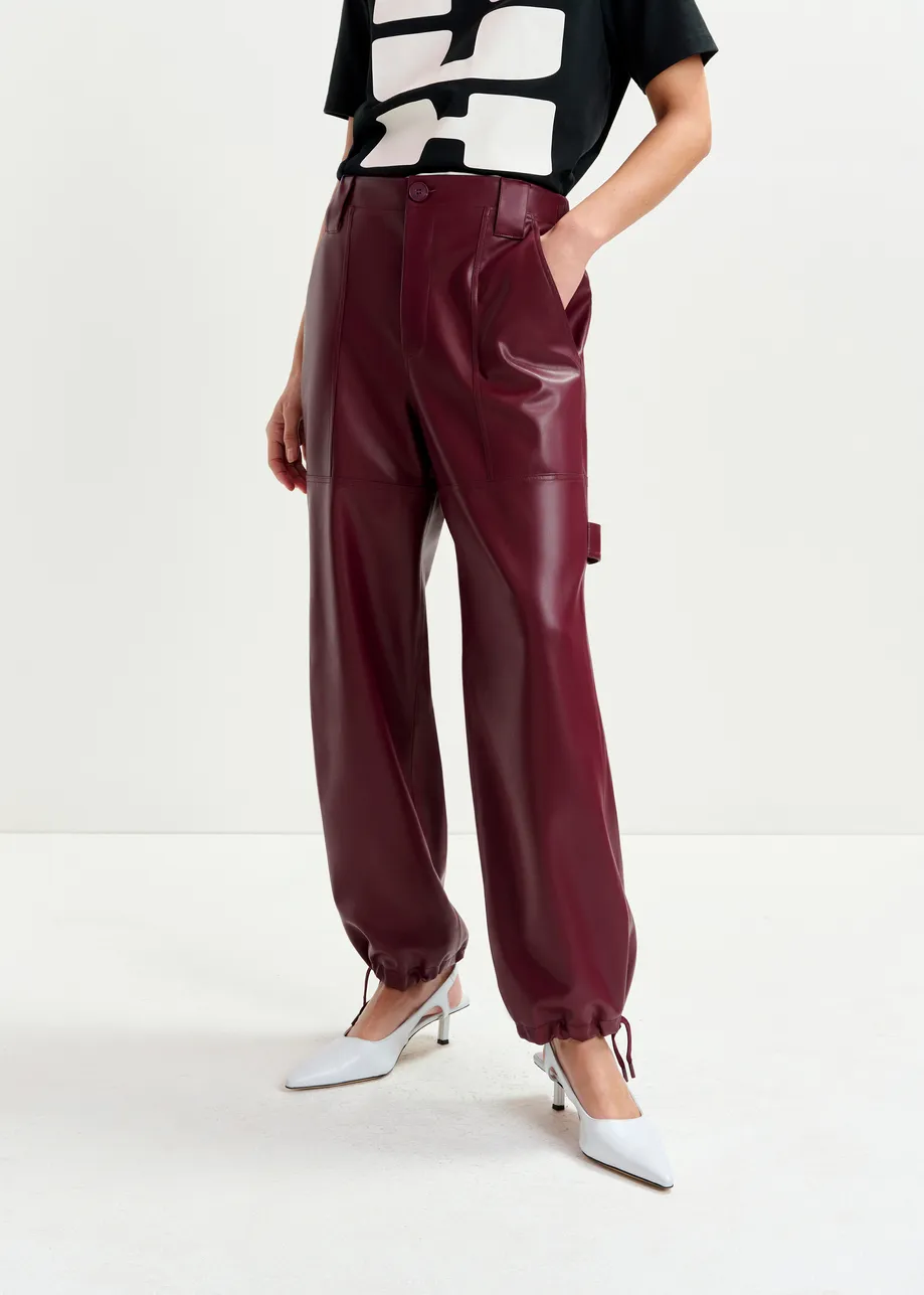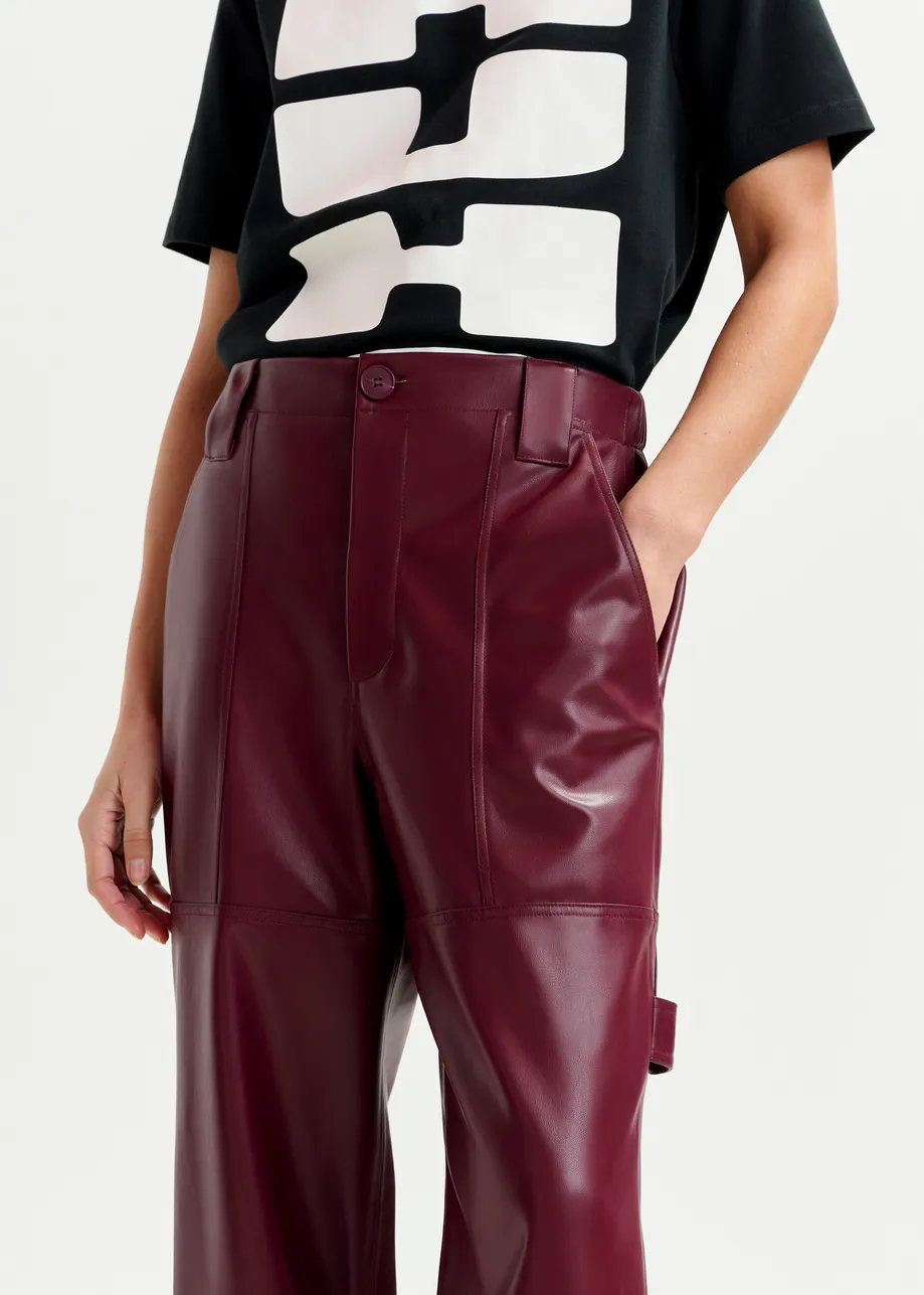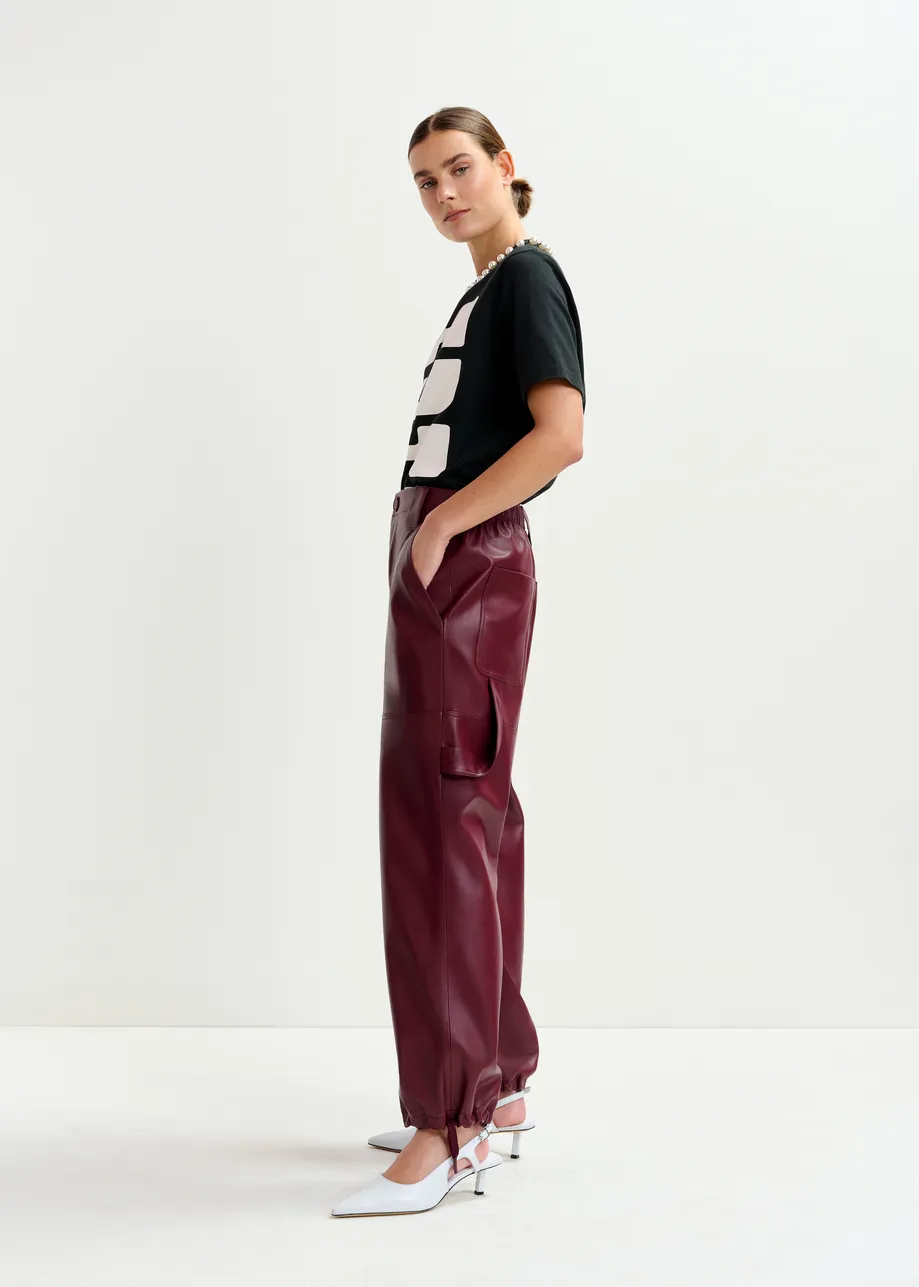 De Itao vegan leren broek van Essentiel Antwerp in de kleur Burgundy. De broek is gemaakt van soepel imitatieleer. Ontworpen voor een relaxte pasvorm, valt laag op de heupen en loopt uit in een brede, subtiel taps toelopende pijp die bij de elastische manchetten wordt aangespannen voor een utilitaire uitstraling.  Combineer de Itao vegan leren broek b.v. met de Inglewood blouse in de kleur burgundy of de Izura trui van Essentiel Antwerp om de look compleet te maken. Deze en andere mooie items van Essentiel Antwerp vind je bij Louvigne op de webshop;.