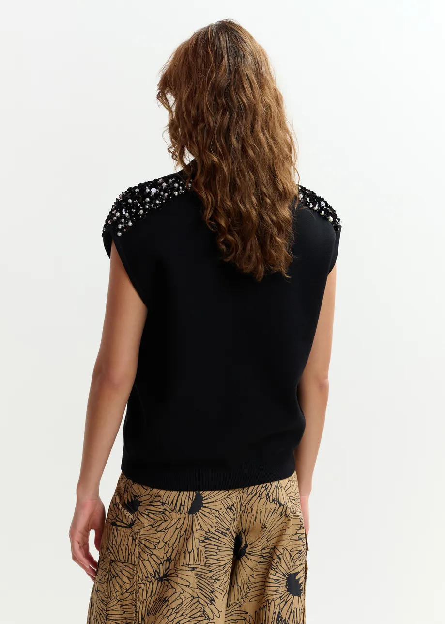 De Joline top / polo van Essentiel Antwerp in de kleur black. Mouwloze polo in tricot met een relaxte pasvorm en een strak, gestroomlijnd silhouet. Het ontwerp wordt naar een hoger niveau getild met borduurwerk van pailletten en kralen langs de schouders, terwijl de geribbelde zoom onderaan het ontwerp een subtiele dosis structuur geeft. Combineer de Joline top zoals afgebeeld op de foto met de Josy cargobroek om de look compleet te maken. Echter kun je de Joline top ook prima op een jeans of leuke rok dragen. Deze en andere mooie items van Essentiel Antwerp vind je bij Louvigne op de webshop.m